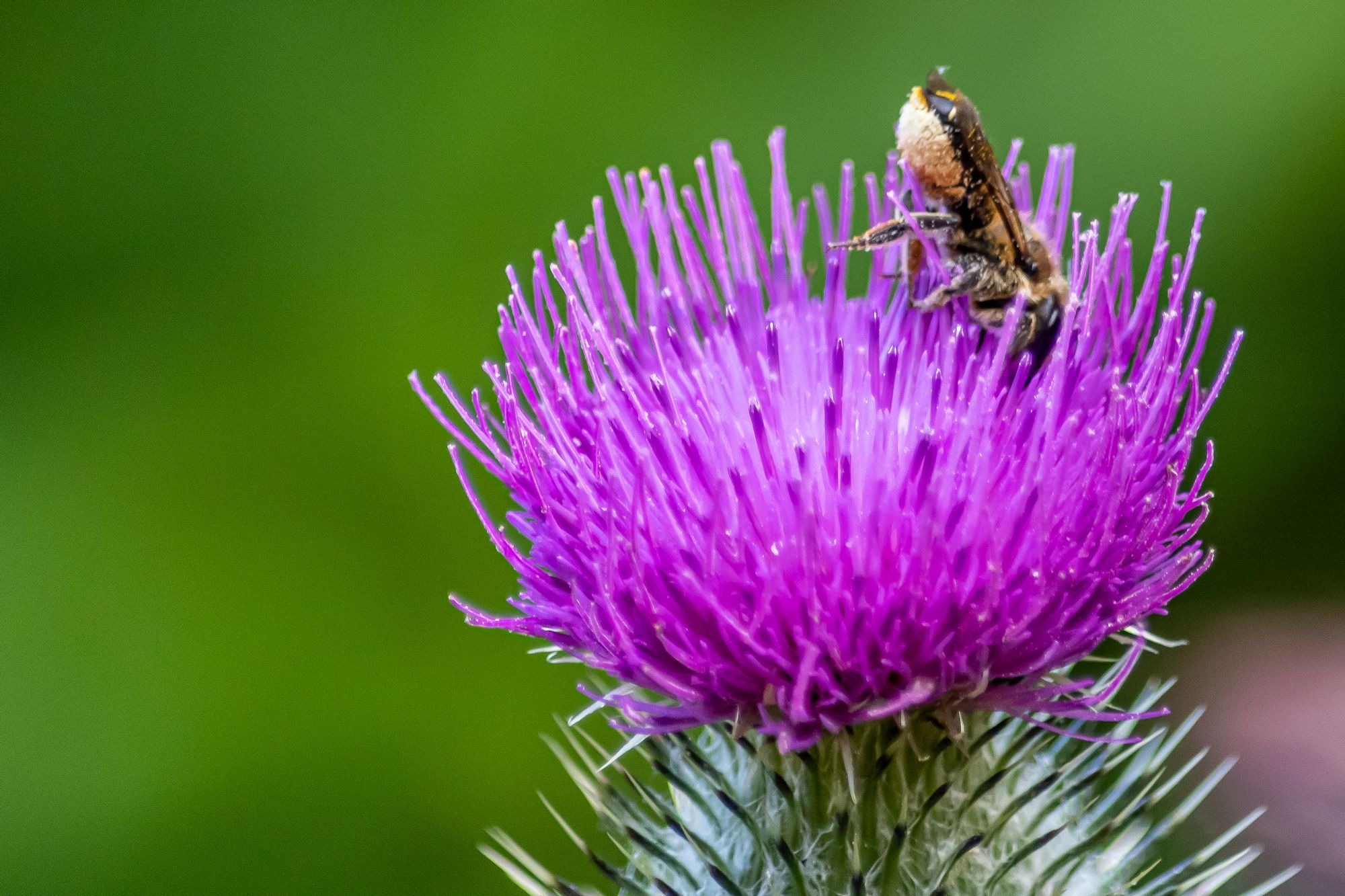 I am sitting on a bench staring very hard at a thistle.
