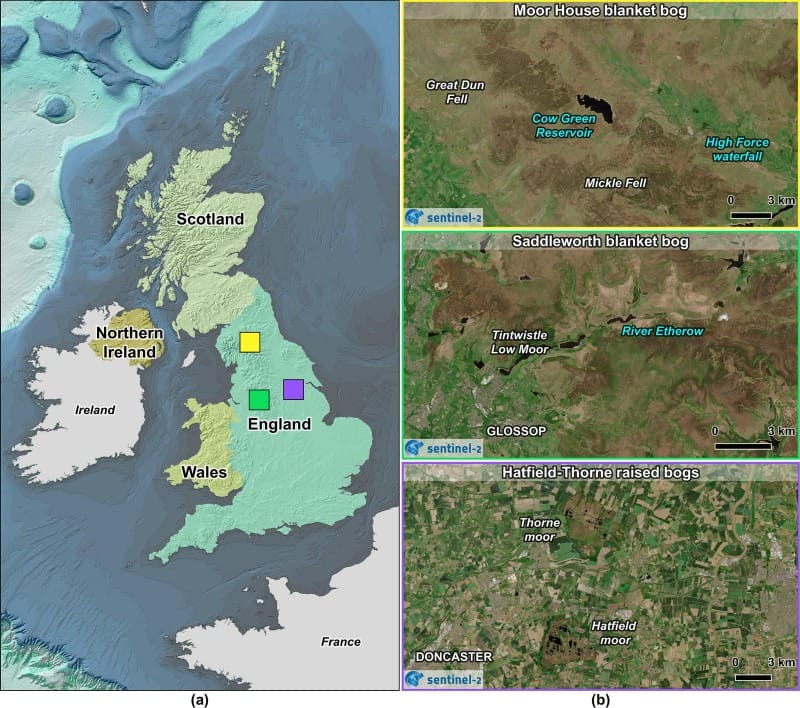 Peat | Scientists in Italy have used satellite data to assess the condition of England’s peatlands – and the results are alarming. Data collected by Sentinel-1 reveals that peatland at Moor House, Saddleworth Moor and Hatfield-Thorne is almost universally subsiding. At the former two moors, which are blanket bogs, the cause appears to be fire, both wild and controlled. At the latter, a raised bog, subsidence is linked to changes in the water table and may be connected to climate change. There was one small sign of hope: on parts of Saddleworth Moor where long-term restoration has taken place, including the re-establishment of cotton grass, cloudberry and sphagnum moss, ground levels are rising, suggesting that peat can recover when vegetation is restored. The study was published in Remote Sensing of Environment.