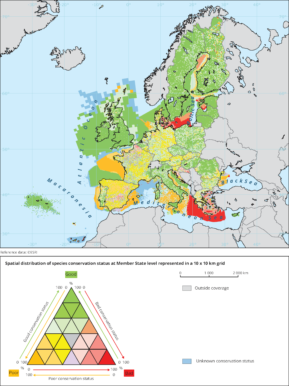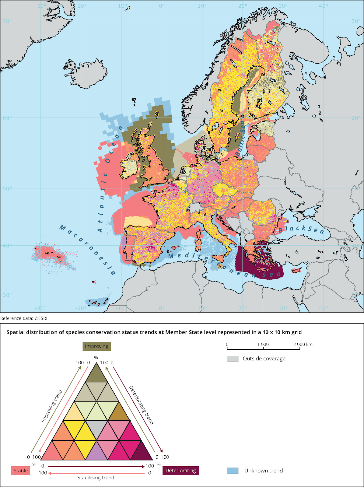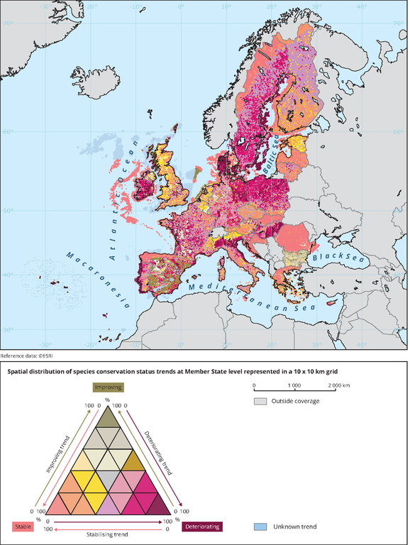 As with habitats, the report looks at the trends for species over time across the continent. This map shows that species in the UK are generally in a stable condition – and that marine species are improving.