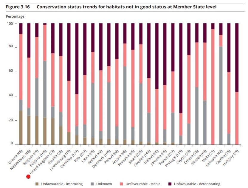 The EU report looks at whether habitats are improving, deteriorating, or in a stable condition. The following data concerns habitats in poor or bad condition (of the habitats in good condition, 87 percent are stable and 12 percent are improving).