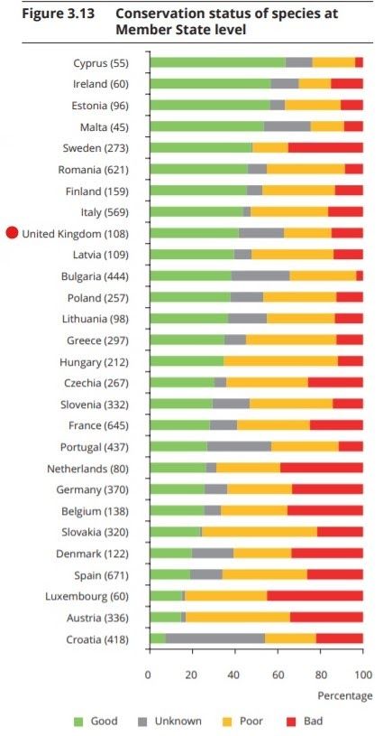 The graph below makes the UK’s position in this league table of destruction clearer (I’ve highlighted the UK with a red dot). There’s little consolation in the fact that Denmark and Belgium appear to have failed even more dramatically than the UK in safeguarding their natural environment; the three nations have the highest percentage of habitats in a bad condition.