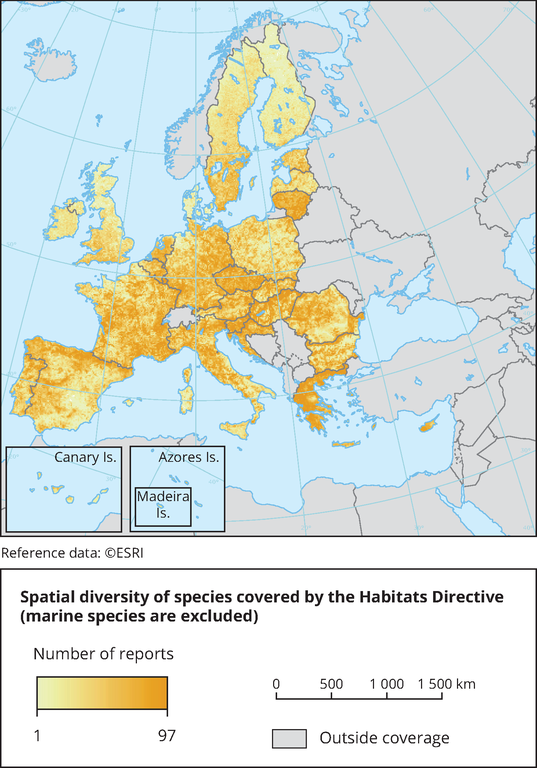 The EU report also shows the conservation status of species across member states, alongside an assessment of whether conditions are improving or deteriorating. The picture here isn’t quite so grim; but before we go into that, it’s worth considering this map showing the diversity of species across the continent.